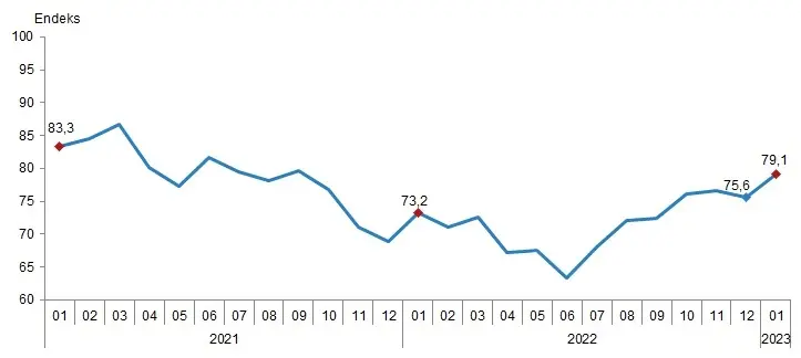 شاخص اعتماد مصرف کننده که از نتایج نظرسنجی گرایش مصرف کننده با همکاری موسسه آمار ترکیه و بانک مرکزی جمهوری ترکیه محاسبه شده است، در ژانویه نسبت به ماه قبل 4.6 درصد افزایش یافته است. این شاخص که در دسامبر 75.6 بود، در ژانویه به 79.1 رسید.