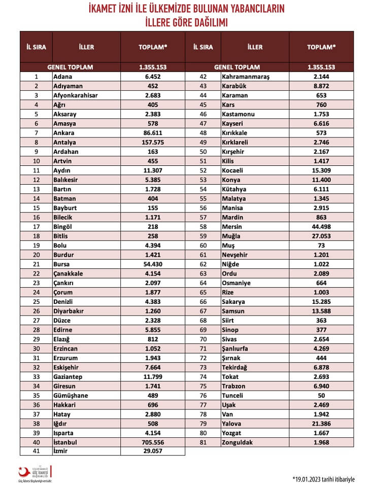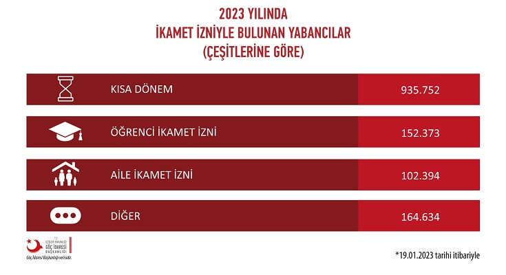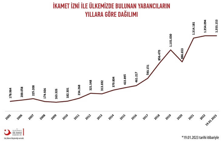 طبق آمار اداره مهاجرت ترکیه در تاریخ 19 ژانویه 2023 تعداد شهروندان خارجی که با مجوز قانونی در ترکیه اقامت دارند از مرز یک میلیون و سیصد و پنجاه و پنج هزار و یکصد و پنجاه و سه نفر گذشت.