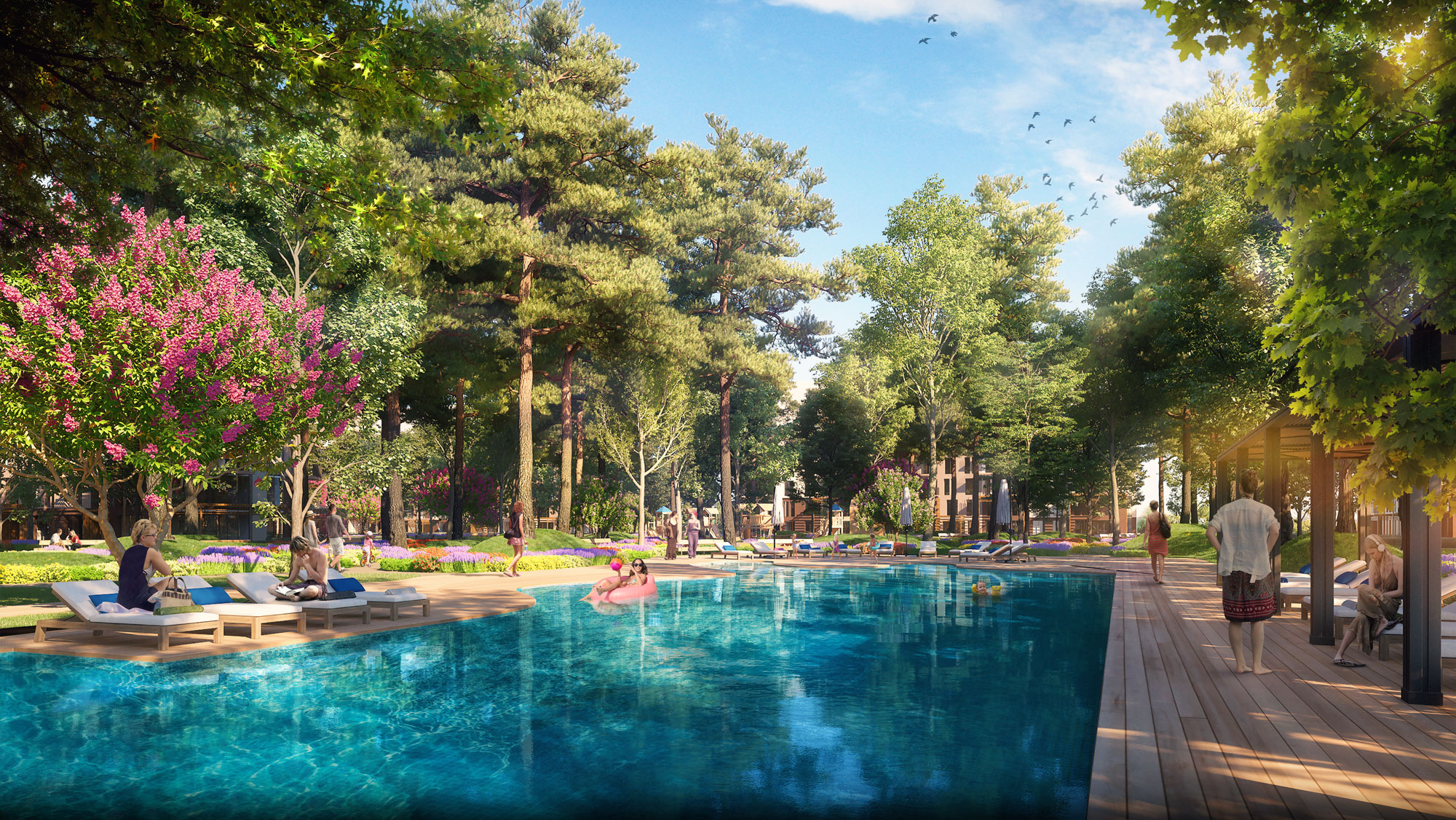 لذت آب تنی و حمام آفتاب در کنار استخر با منظره بیشه