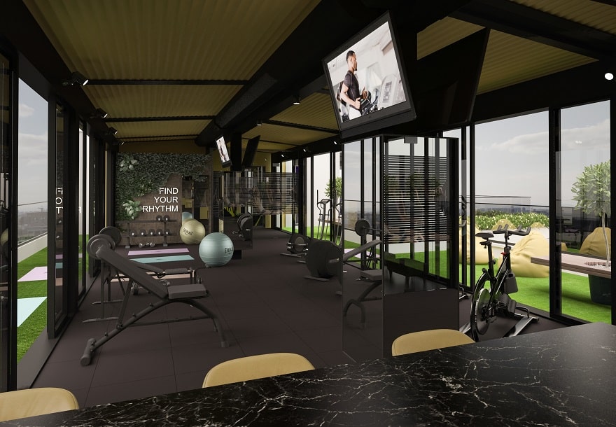 یک باشگاه تناسب اندام پیشرفته که در بالای بلوک مسکونی قرار دارد، دارای باغی سرسبز و یک بار ویتامین با طراوت است که فضای مناسبی را برای علاقه مندان به سلامتی و تندرستی فراهم می کند تا بتوانند دوباره شارژ و تجدید قوا کنند.